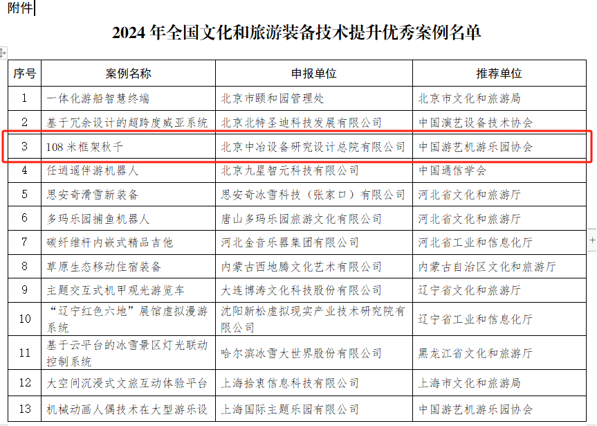 6月12日,文化和旅游部办公厅、工业和信息化部办公厅印发通知,公布2024年全国文化和旅游装备技术提升优秀案例名单,中冶设备总院108米框架秋千成功入选。